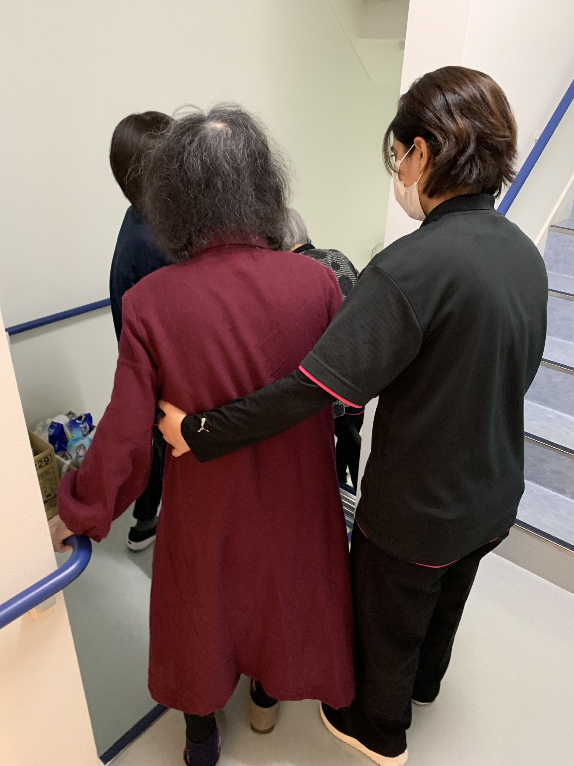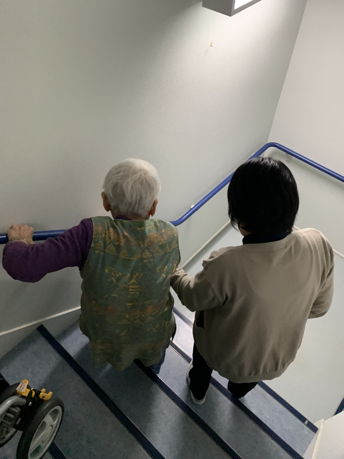 車椅子の方を抱えて、階段から降りる練習もしました。
